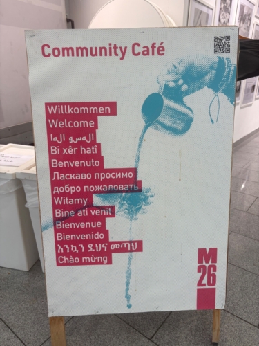 Contrary to the media coverage on Maximilianstrasse and prevalent depictions that associate it as a place of transit, crime and danger, the space inside and in front of M26 appears to be a place of regular and long stays for visitors. Finally, M26 is a space where refugees as well as other visitors feel accepted and give an individual shape to the space by spatial appropriation, be it by a rearrangement of chairs or speaking in the native language in a bigger group and therefore showing a dominant presence in the room. The changing art exhibitions which constitute a crucial part of M26, somehow exist in a parallel way to the Community Café and are mainly curated by non-migrant artists and exhibitors. Julia Falge however confirmed that M26 aims at including more migrant perspectives and art in the future exhibitions